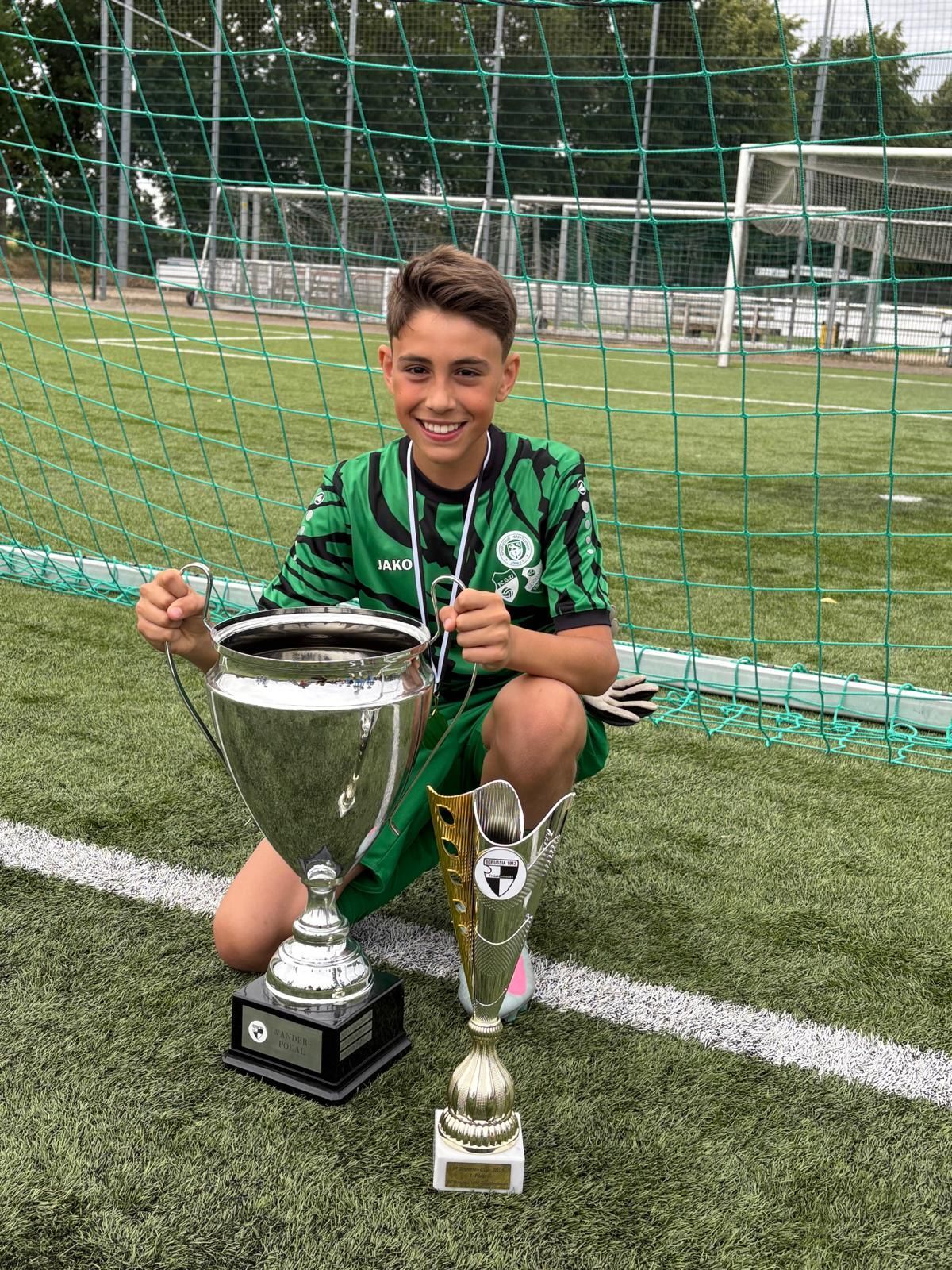 Beim diesjährigen Hehlrather Sommercup überzeugte Lennard Lörgen (Jahrgang 2014) mit einer starken Leistung im Tor. Die #210 der Torwartschule wurde am Ende der Turniers, mit dem Pokal für den besten Torhüter ausgezeichnet. Lennard beeindruckte nicht nur mit seiner Reaktionsschnelligkeit und Spielübersicht, sondern auch durch seine kontinuierliche Entwicklung, die sich auch im Einzeltraining während der Osterferien bemerkbar machte. Seine hohe Trainingsbeteiligung und sein Ehrgeiz zahlen sich aus – eine großartige Leistung, die Lust auf mehr macht!